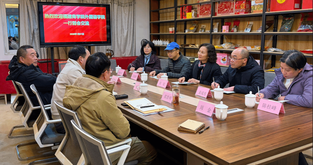 为深入贯彻落实教育部“访企拓岗促就业”专项行动部署要求,1月23日下午,外国语学院院长池玫、副院长童成寿带队,率英语系主任陈桂峰及部分骨干教师一行五人,赴福建省自贸国际商会开展专项调研走访。本次活动得到商会高度重视,会长韦斌携核心管理团队全程热情接待,双方围绕产教深度融合、创新人才培养模式、毕业生实习就业合作等关键议题,开展了深入务实的交流研讨。经充分磋商,双方就进一步深化合作达成初步共识,为后续协作事项的推进搭建了良好平台,也为未来构建长效合作机制奠定了坚实基础。