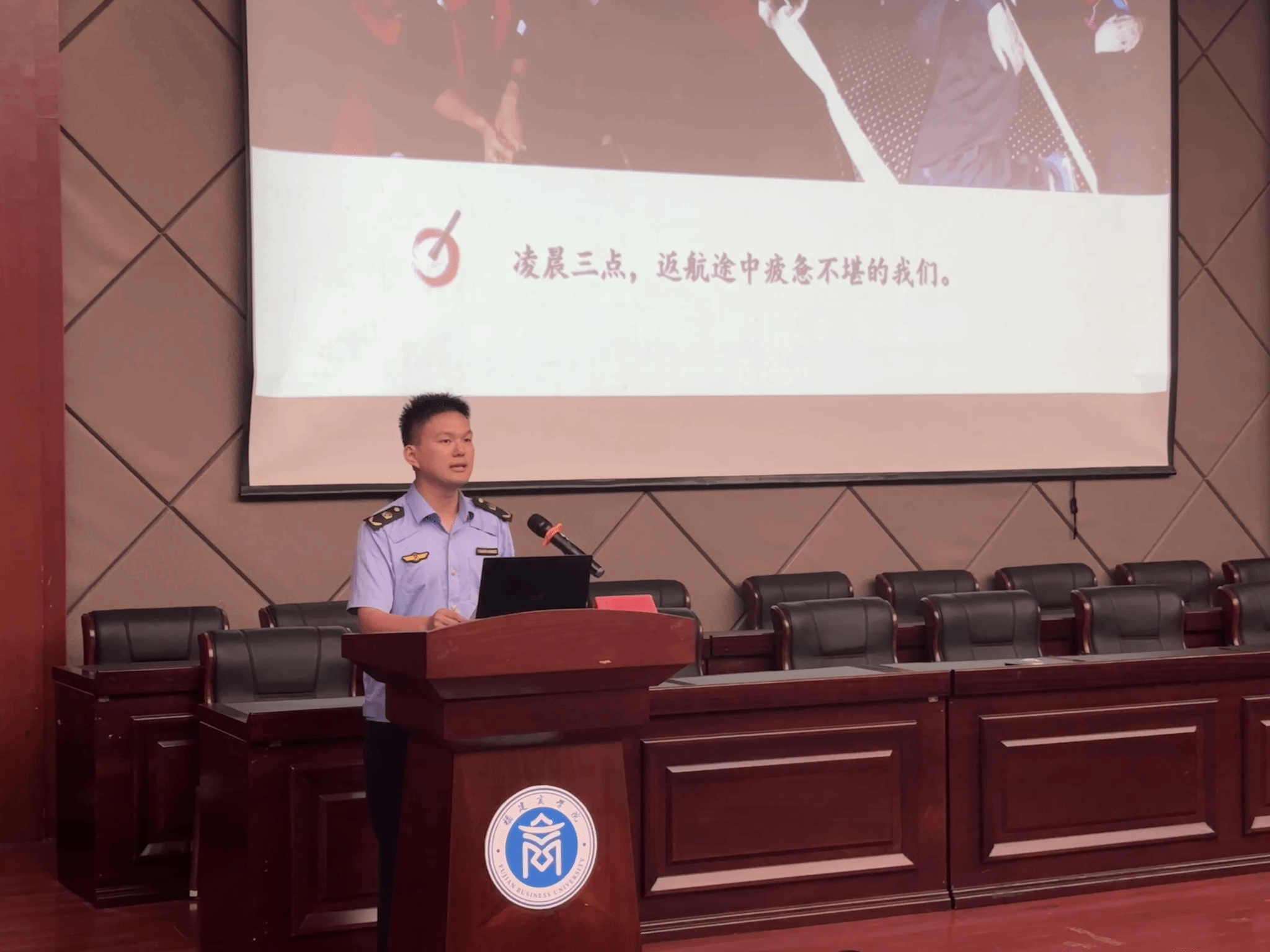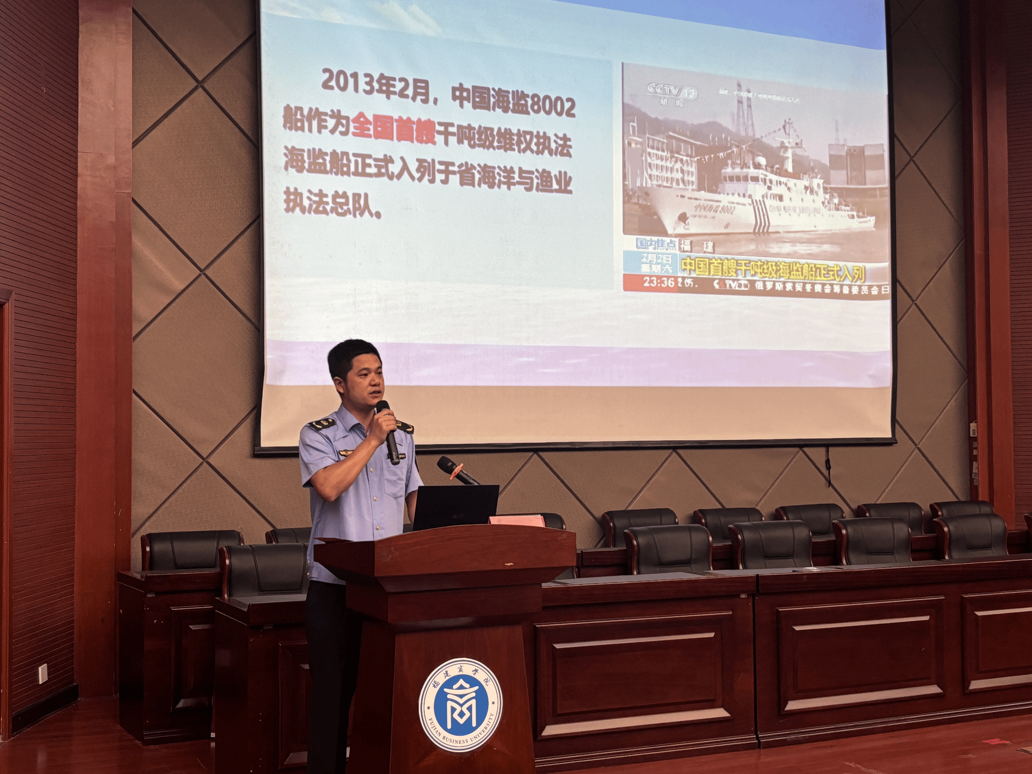 为纪念中国人民抗日战争暨世界反法西斯战争胜利80周年,激励广大师生传承红色基因、赓续红色血脉,9月23日,外国语学院开展“弘扬伟大抗战精神,青年矢志奋斗担当”爱国主义教育主题讲座。本次活动特邀福建省海洋与渔业执法总队执法船船长、“全国人民满意的公务员”邱卫华主讲。陈发义政委一行8人、学院党委副书记杨爱娥、全体辅导员和近300名学生参与本次活动。