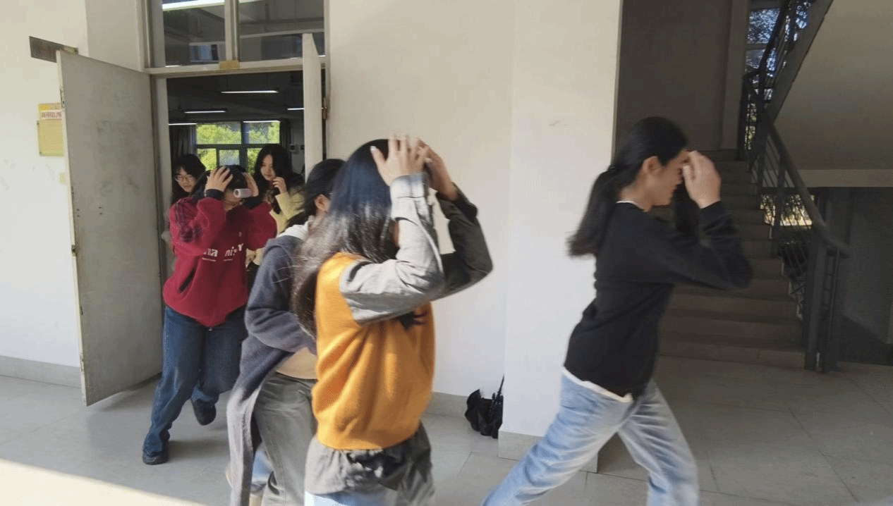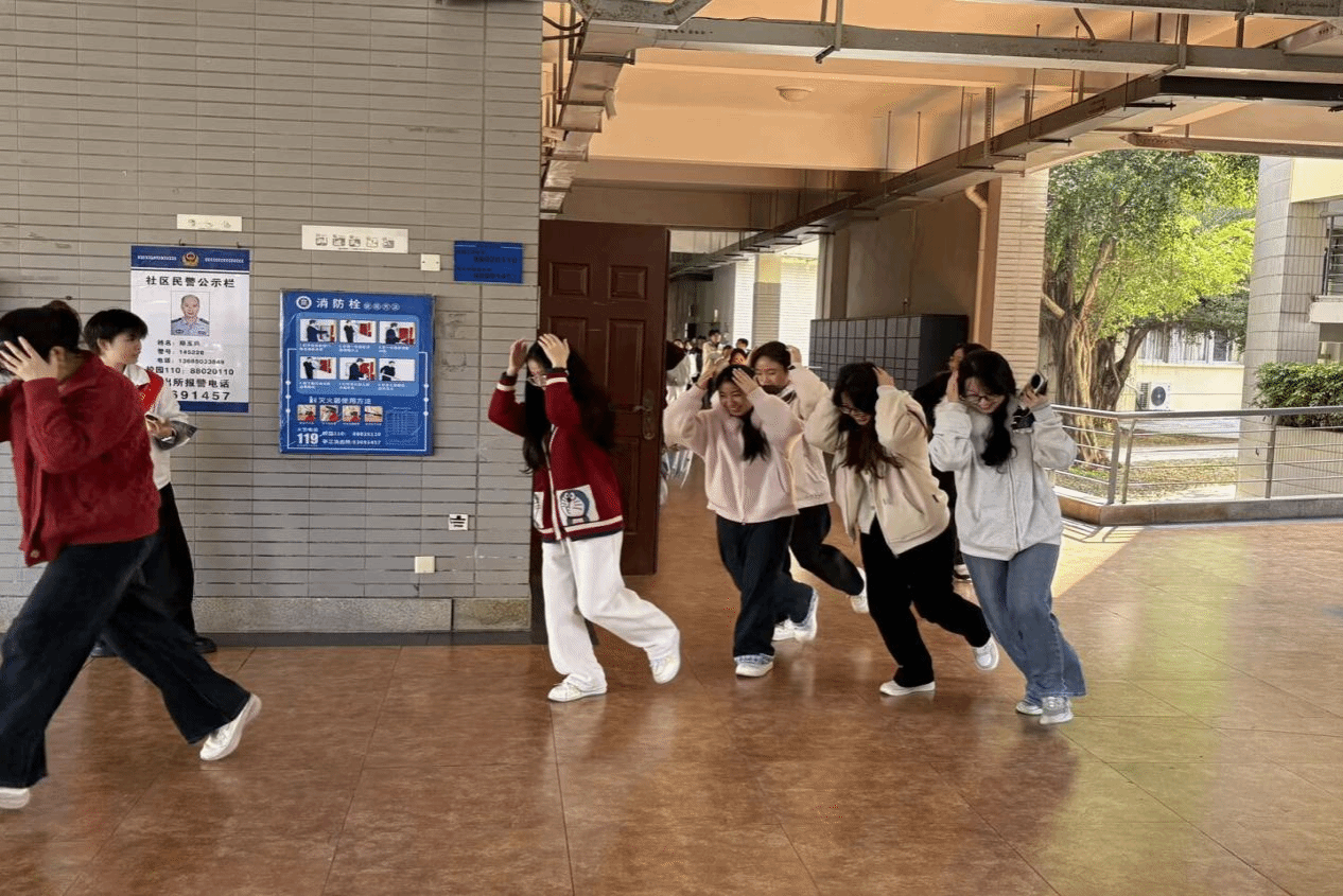 随着警报声响起,全体学生迅速反应,沉着冷静地就近躲避。大家双手抱头、弯腰低身,迅速蜷缩至课桌下方或墙角等安全区域。随后,在老师和现场工作人员的引导下,学生们按照预定疏散路线,快速、有序地撤离至操场安全区域。整个疏散过程紧张有序、行动迅速,充分展现了师生良好的应急反应能力和协作配合精神。